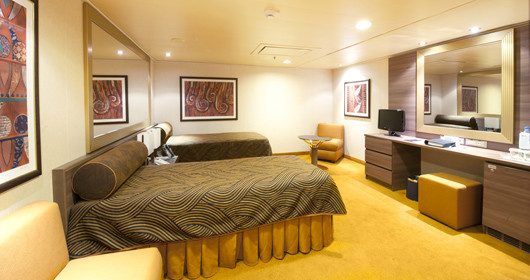 - Cabine com Varanda: Cama de Casal ou 02 Camas de Solteiro, Banheiro com Chuveiro ou Banheira, Ar Condicionado, Armário, Penteadeira com Secador de Cabelo, Tv, Telefone, Cofre, Frigobar e Varanda.