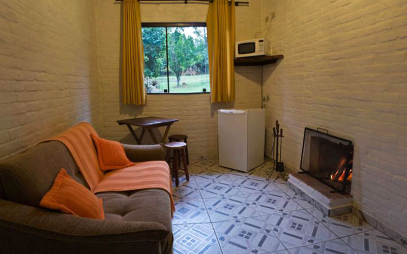 CHALÉS: 2 Camas de Casal, 1 Sofá Cama, Micro-ondas, Frigobar, Mesinha e Lareira (apenas nos Chalés).