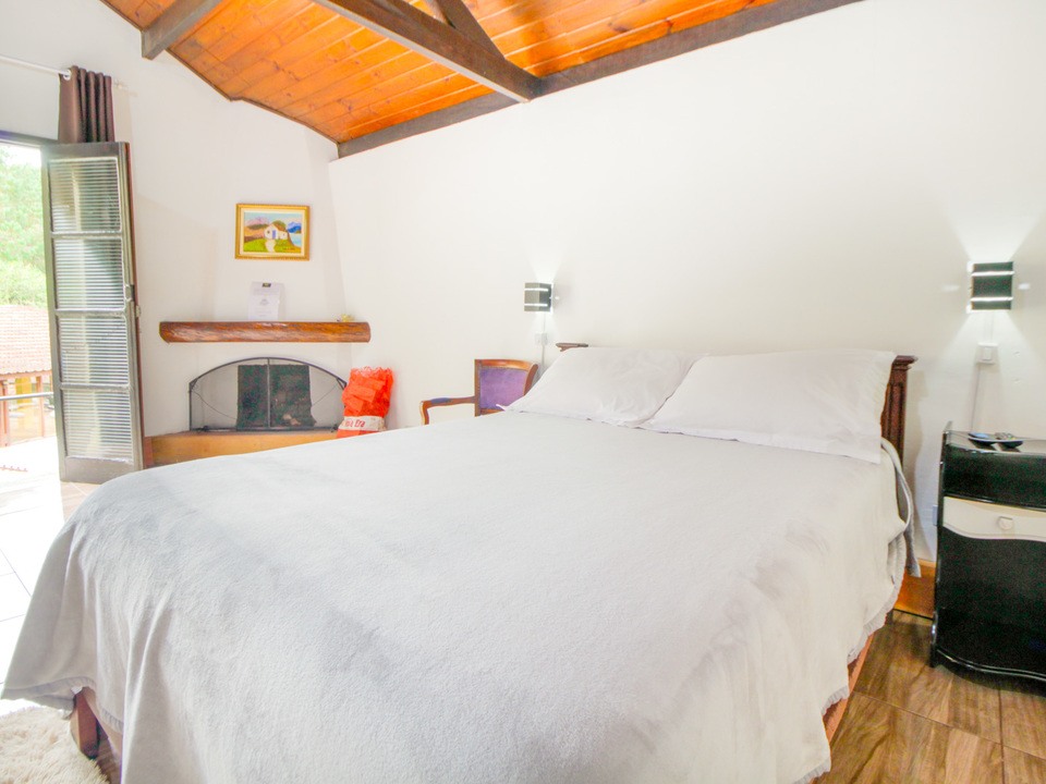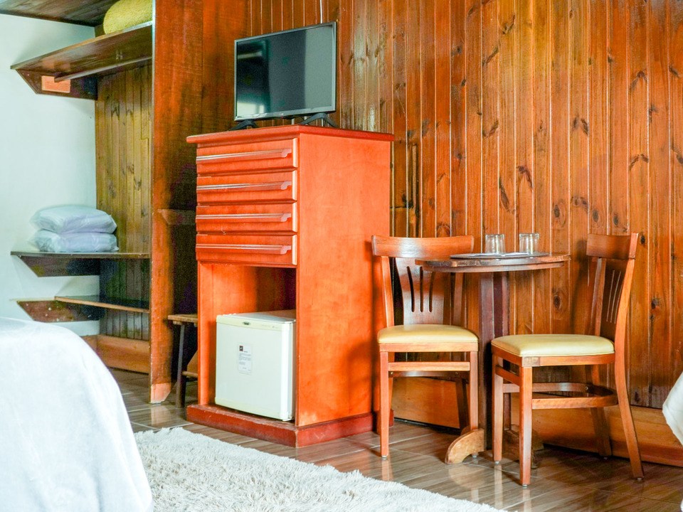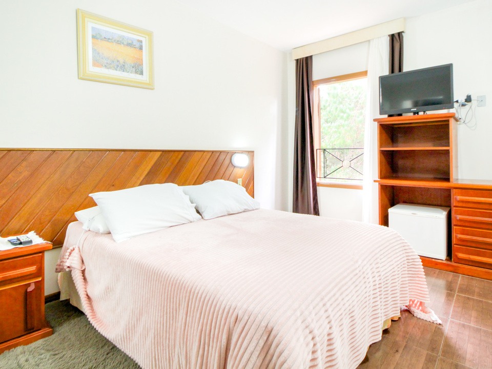 Acomoda até 2 pessoas. Cama de casal, vista para as montanhas, frigobar, Wi-Fi, Tv de Led com canais a cabo, guarda-roupa ou armários, mesa com cadeiras, enxoval completo, tomadas próximas a cama e chuveiro quente/frio (ducha à gás).
