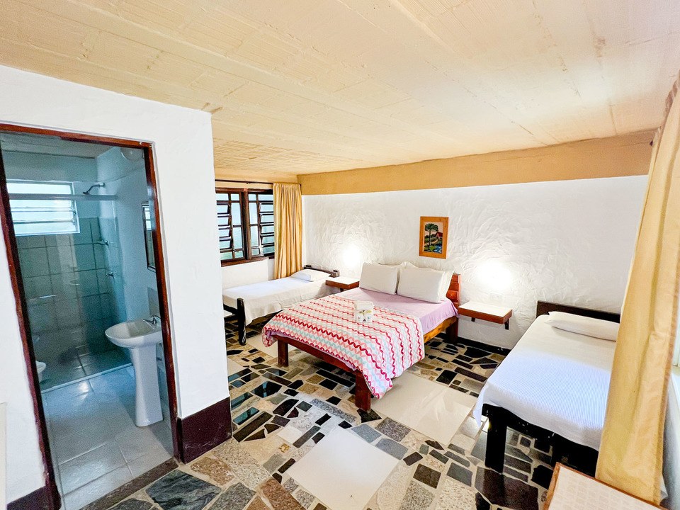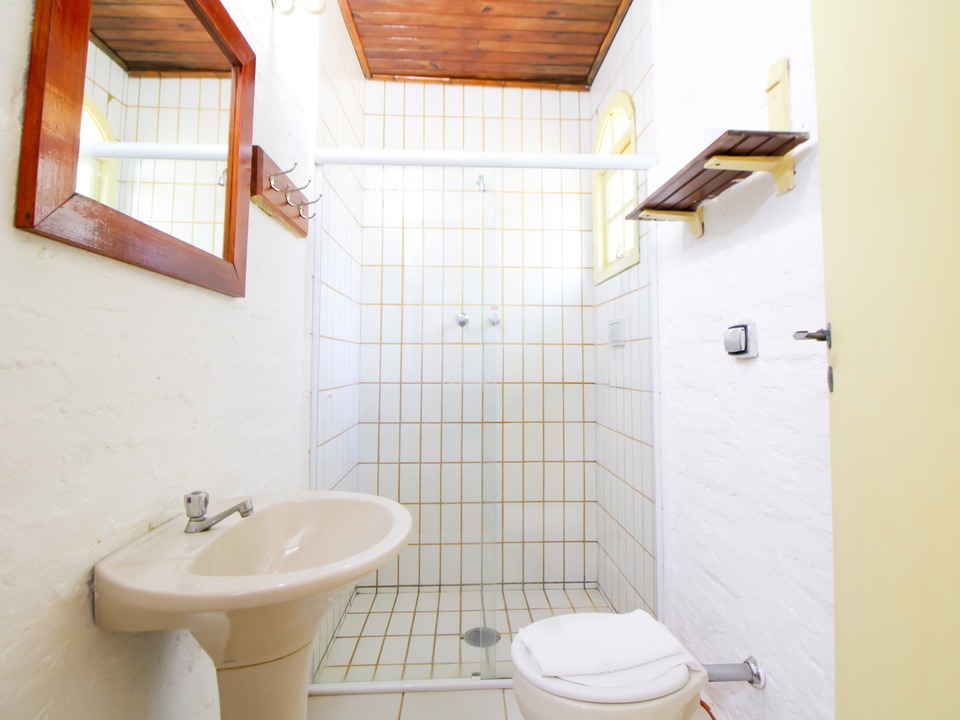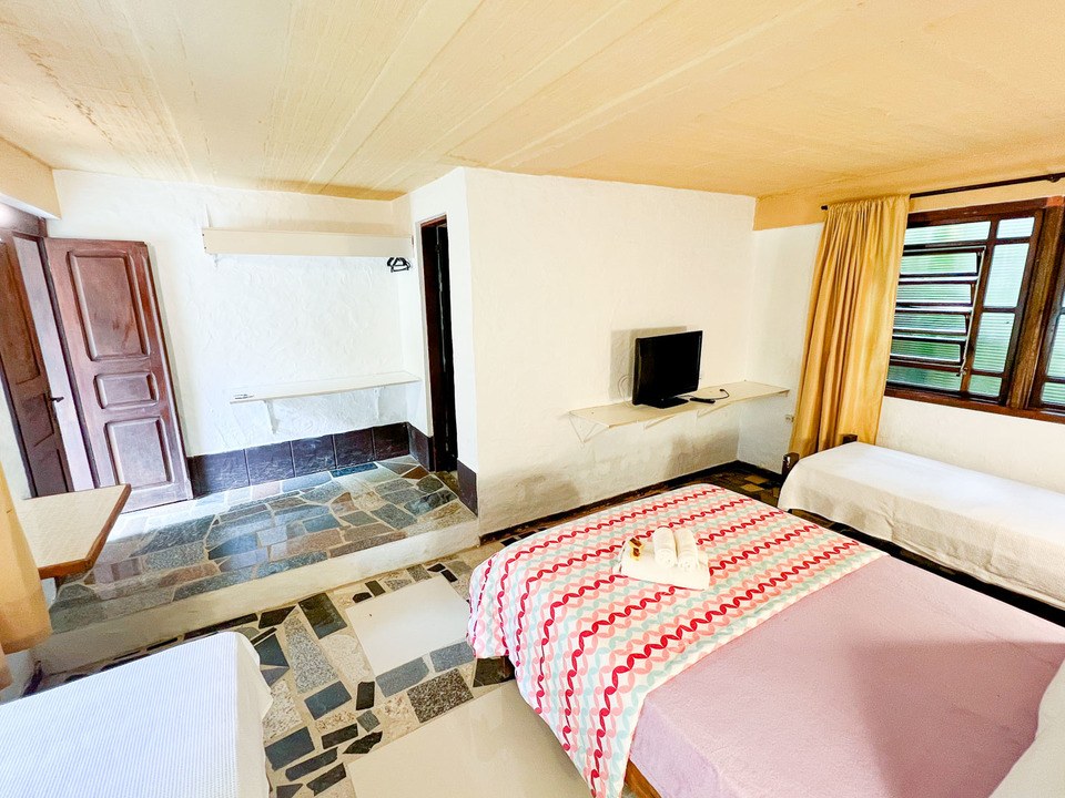 Acomoda até 3 pessoas. Com 1 cama de casal e 1 cama de solteiro, aquecimento, Tv de led, Wi-Fi, frigobar, enxoval completo, chuveiro quente/frio e vista para o pátio interno.