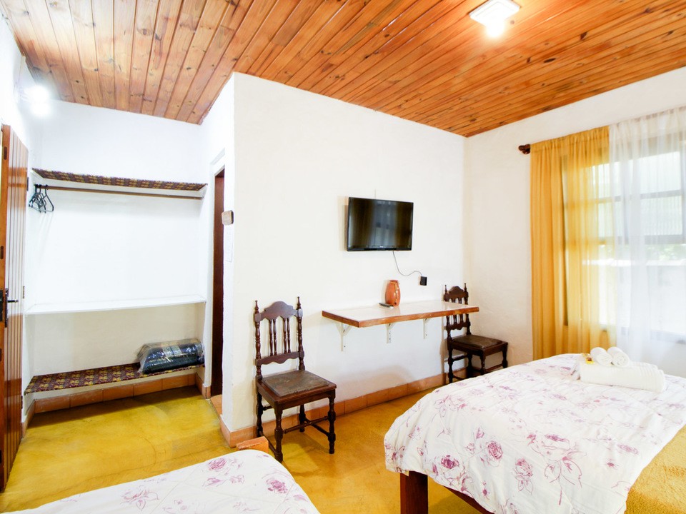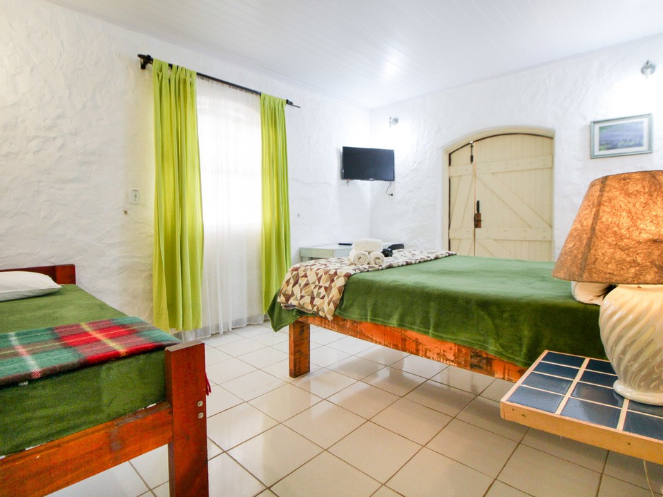 Acomoda até 4 pessoas, ideal para famílias. Com 1 cama de casal e 2 camas de solteiro, aquecimento, Tv de led, Wi-Fi, frigobar, enxoval completo, chuveiro elétrico e vista para o jardim.